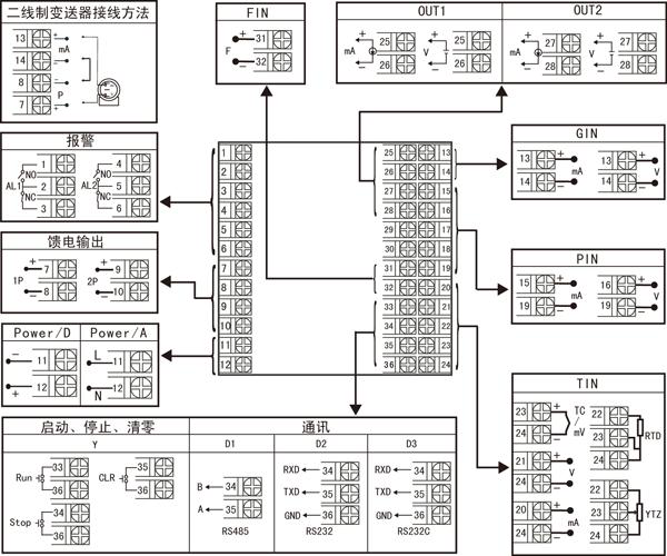 2、選型時(shí)請根據(jù)接線圖來選擇功能,由于尺寸小的儀表接線端子少帶不了全功能,有的功能在同組端子上只能選擇其中一種功能。