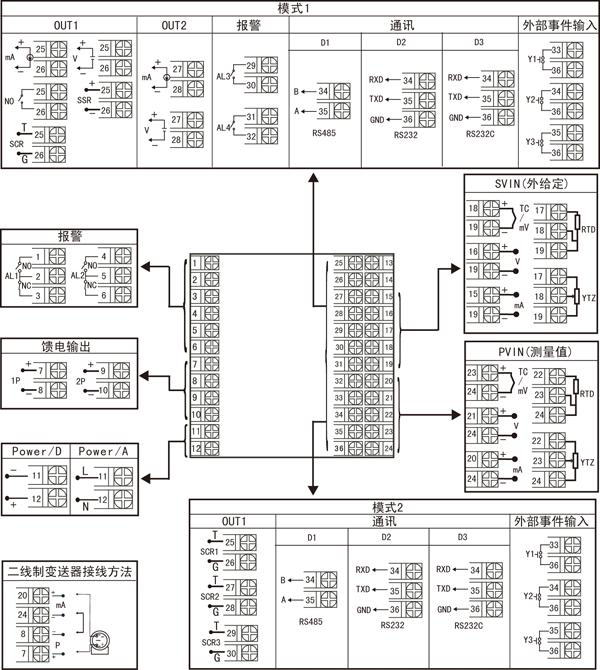 3、規(guī)格尺寸為D、E型的儀表,接線端子25~36間如有帶報(bào)警功能,繼電器觸點(diǎn)容量為AC125V/0.5A、DC24V/0.5